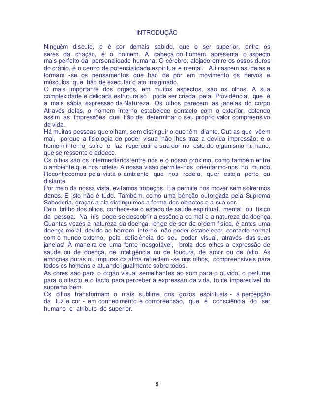 8. 8. 8 INTRODUÇÃO Ninguém discute, e é por demais sabido, que o ser superior, entre os seres da criação, é o homem. A cabeça do homem apresenta o aspecto mais perfeito da personalidade humana. O cérebro, alojado entre os ossos duros do crânio, é o centro de potencialidade espiritual e mental. Ali nascem as ideias e formam -se os pensamentos que hão de pôr em movimento os nervos e músculos que hão de executar o ato imaginado. O mais importante dos órgãos, em muitos aspectos, são os olhos. A sua complexidade e delicada estrutura só pôde ser criada pela Providência, que é a mais sábia expressão da Natureza. Os olhos parecem as janelas do corpo. Através delas, o homem interno estabelece contacto com o exterior, obtendo assim as impressões que hão de determinar o seu próprio valor compreensivo da vida. Há muitas pessoas que olham, sem distinguir o que têm diante. Outras que vêem mal, porque a fisiologia do poder visual não lhes traz a devida impressão; e o homem interno sofre e faz repercutir a sua dor no esto do organismo humano, que se ressente e adoece. Os olhos são os intermediários entre nós e o nosso próximo, como também entre o ambiente que nos rodeia. A nossa visão permite-nos orientarmo-nos no mundo. Reconhecemos pela vista o ambiente que nos rodeia, quer esteja perto ou distante. Por meio da nossa vista, evitamos tropeços. Ela permite nos mover sem sofrermos danos. E isto não é tudo. Também, como uma bênção outorgada pela Suprema Sabedoria, graças a ela distinguimos a forma dos objectos e a sua cor. Pelo brilho dos olhos, conhece-se o estado de saúde espiritual, mental ou físico da pessoa. Na íris pode-se descobrir a essência do mal e a natureza da doença. Quantas vezes a natureza da doença, longe de ser de ordem física, é antes uma doença moral, devido ao homem interno não poder estabelecer contacto normal com o mundo externo, pela deficiência do seu poder visual, através das suas janelas! À maneira de uma fonte inesgotável, brota dos olhos a expressão de saúde ou de doença, de inteligência ou de loucura, de amor ou de ódio. As emoções puras ou impuras da alma reflectem -se nos olhos, compreensíveis para todos os homens e atuando igualmente sobre todos. As cores são para o órgão visual semelhantes ao som para o ouvido, o perfume para o olfacto e o tacto para perceber a expressão da vida, fonte imperecível do supremo bem. Os olhos transformam o mais sublime dos gozos espirituais - a percepção da luz e cor - em conhecimento e compreensão, que é consciência do ser humano e atributo do superior.