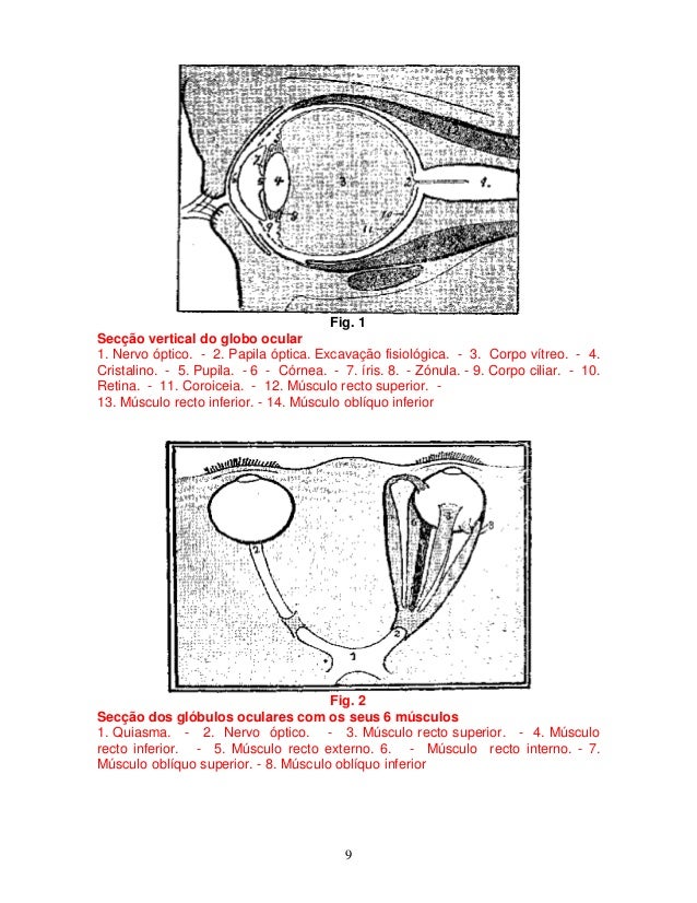 9. 9. 9 Fig. 1 Secção vertical do globo ocular 1. Nervo óptico. - 2. Papila óptica. Excavação fisiológica. - 3. Corpo vítreo. - 4. Cristalino. - 5. Pupila. - 6 - Córnea. - 7. íris. 8. - Zónula. - 9. Corpo ciliar. - 10. Retina. - 11. Coroiceia. - 12. Músculo recto superior. - 13. Músculo recto inferior. - 14. Músculo oblíquo inferior Fig. 2 Secção dos glóbulos oculares com os seus 6 músculos 1. Quiasma. - 2. Nervo óptico. - 3. Músculo recto superior. - 4. Músculo recto inferior. - 5. Músculo recto externo. 6. - Músculo recto interno. - 7. Músculo oblíquo superior. - 8. Músculo oblíquo inferior