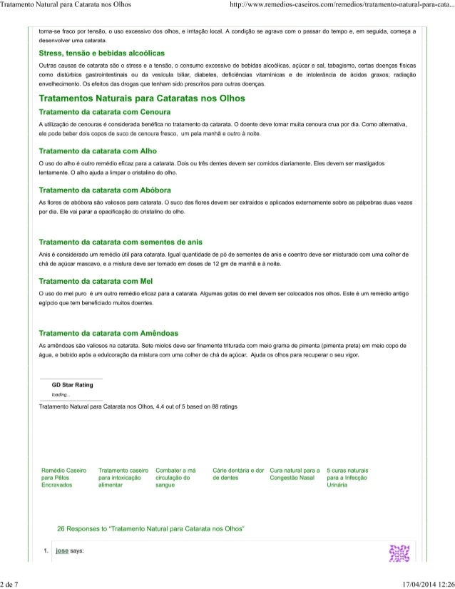1. 1. Tratamento Natural para Catarata nos Olhos http: //www. remedios-caseiros. com/ remedios/ tratamento-natural-para-cata. .. "INICIO REMÉDIOS CHÁS EMAGRECER DICAS PLANTAS MEDICINAIS AR11GOS DESAÚDE n Home » Remédios » Tratamento Natural para Catarata nos Olhos Tratamento Natural para Catarata nos Olhos Add comments Alternativas a cirurgia aos olhos com cataratas A catarata é uma doença do olho muito comum. As cataratas afeta o cristalino que é uma área da lente dos olhos, tornando esbranquiçados e opacos em vez de estarem cristalinos e consequentemente não deixam a Iuz entrar no olho e a pessoa doente com cataratas deixa de ver claramente. Com o tempo o cristalino fica cada vez mais opaco, até produzir cegueira. Cataratas nos olhos Exemplo de cataratas nos olhos Sintomas das Cataratas nos Olhos O primeiro sinal das Cataratas é a visão turva. A pessoa tem dificuldade de ver bem focado. Conforme a doença progride pode se ter visão dupla e ganhar manchas brancas nos olhos. Causas das Cataratas nos Olhos Deterioração da Lente Há três factores que contribuem para a perda da transparência do cristalino. Trata-se de deterioração na nutrição do cristalino que diminui a vitalidade e a resistência das ñbras da lente; depósitos de ácidos e sais entre as fibras da lente que têm um efeito irritante sobre os tecidos da lente e exercem uma pressão crescente sobre as suas fibras delicadas. Toxinas no Sangue, estilo de vida deficiente Como na maioria das doenças, toxinas na corrente sanguínea, devido a erros dietéticos e um estilo de vida deficiente, são a verdadeira causa da catarata. A matéria tóxica no sangue se espalha pelo corpo para encontrar abrigo em qualquer lugar disponivel fraco. Surpreende a lente se 1 de 7 17/04/2014 12:26