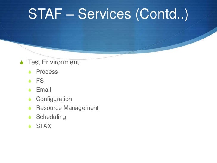 6. 6. STAF – Services (Contd..) S Test Environment S Process S FS S Email S Configuration S Resource Management S Scheduling S STAX