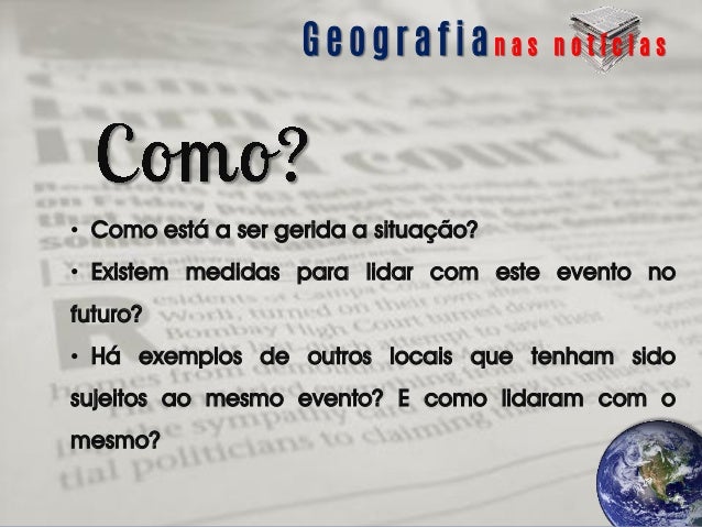 9. 9. Geografianas notícias • Porque aconteceu? • Há alguma explicação geográfica na sua origem? • Existem alguns termos técncios/processos para explicar?