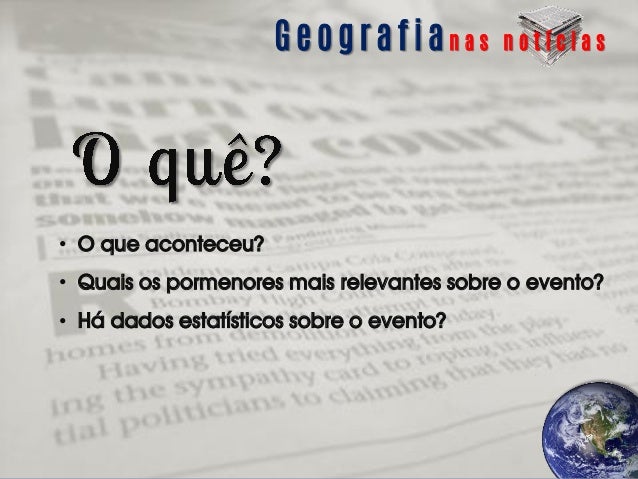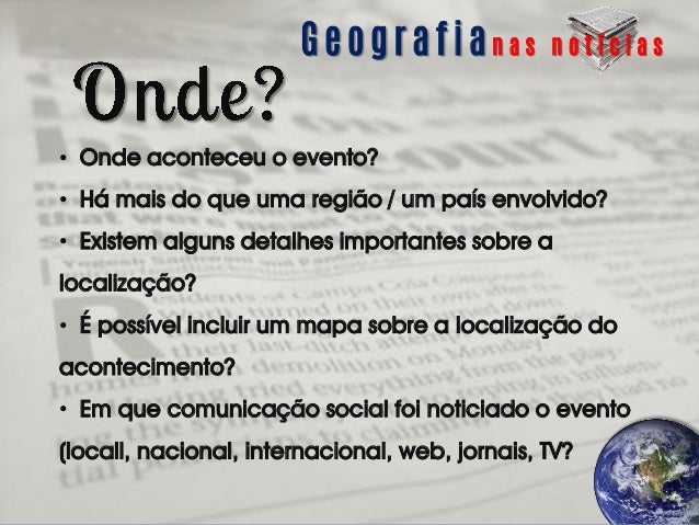 6. 6. Geografianas notícias • Onde aconteceu o evento? • Há mais do que uma região / um país envolvido? • Existem alguns detalhes importantes sobre a localização? • É possível incluir um mapa sobre a localização do acontecimento? • Em que comunicação social foi noticiado o evento (locall, nacional, internacional, web, jornais, TV?