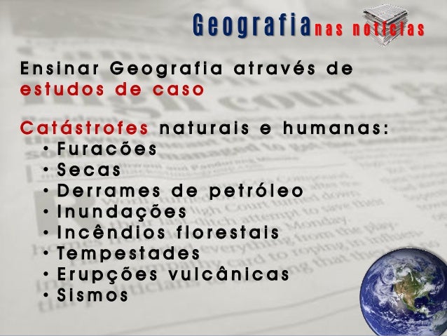 2. 2. Geografianas notícias Ensinar Geografia através de estudos de caso Catástrofes naturais e humanas: • Furacões • Secas • Derrames de petróleo • Inundações • Incêndios florestais • Te m p e s t a d e s • Erupções vulcânicas • Sismos