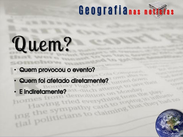 7. 7. Geografianas • Quem provocou o evento? • Quem foi afetado diretamente? • E indiretamente? notícias