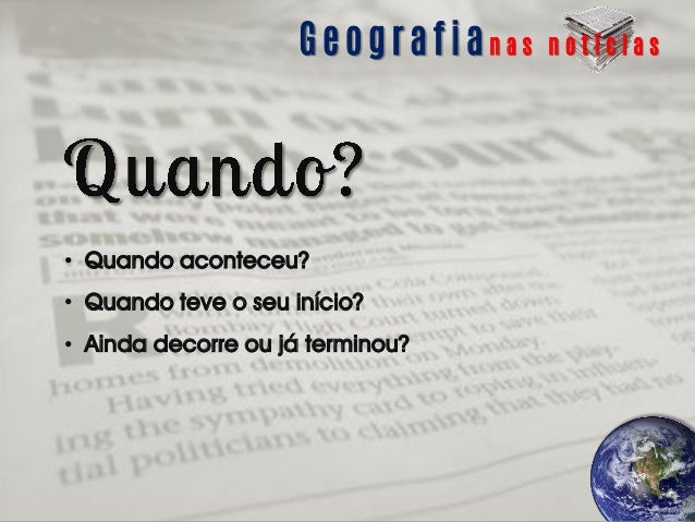 8. 8. Geografianas • Quando aconteceu? • Quando teve o seu início? • Ainda decorre ou já terminou? notícias