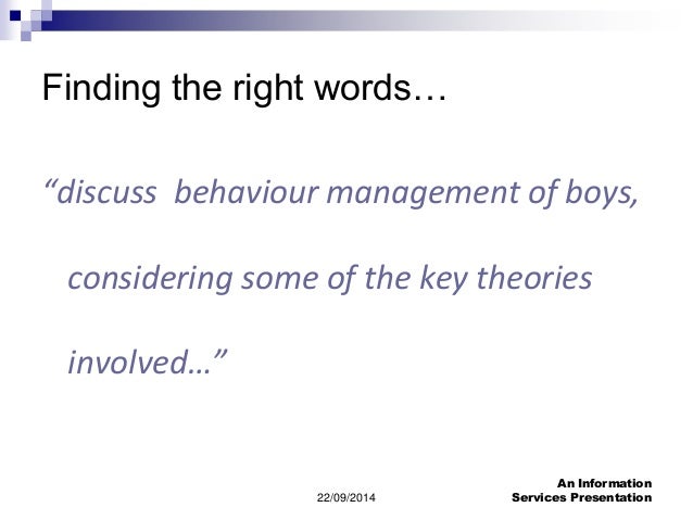 2. 2. 22/09/2014 An Information Services Presentation Finding the right words… “discuss behaviour management of boys, considering some of the key theories involved…”