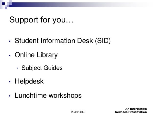 4. 4. 22/09/2014 An Information Services Presentation Support for you… • Student Information Desk (SID) • Online Library • Subject Guides • Helpdesk • Lunchtime workshops