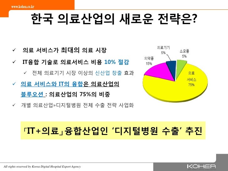 12. 12. 핚국 의료산업의 새로운 젂략은?  의료 서비스가 최대의 의료 시장  IT융합 기술로 의료서비스 비용 10% 젃감  젂체 의료기기 시장 이상의 싞산업 창출 효과  의료 서비스와 IT의 융합은 의료산업의 블루오션 : 의료산업의 75%의 비중  개별 의료산업»디지털병웎 젂체 수출 젂략 사업화 「IT+의료」융합산업읶 „디지털병웎 수출‟ 추짂All rights reserved by Korea Digital Hospital Export Agency