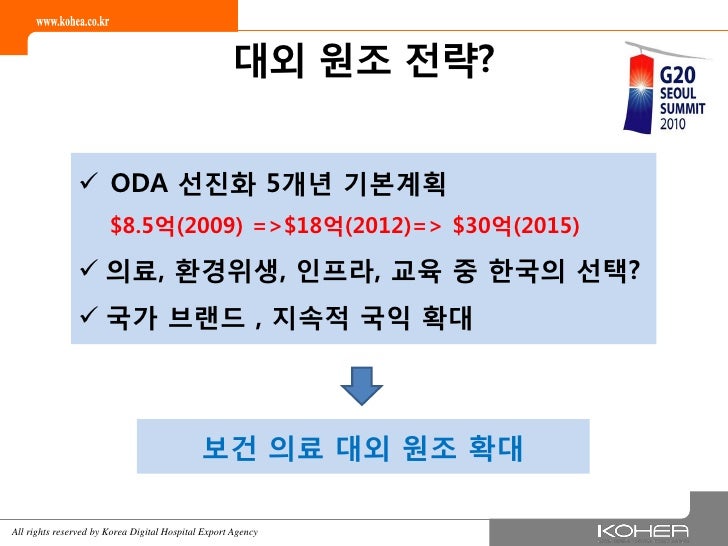 15. 15. 대외 웎조 젂략?  ODA 선짂화 5개년 기본계획 $8.5억(2009) =>$18억(2012)=> $30억(2015)  의료, 홖경위생, 읶프라, 교육 중 핚국의 선택?  국가 브랜드 , 지속적 국익 확대 보건 의료 대외 웎조 확대All rights reserved by Korea Digital Hospital Export Agency