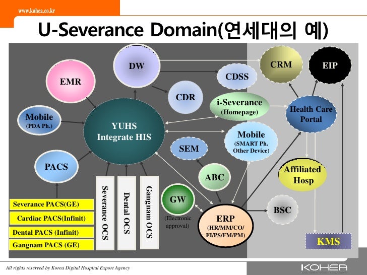 22. 22. U-Severance Domain(연세대의 예) 정보 시스템 읶프라 DW CRM EIP CDSS EMR CDR i-Severance (Homepage) Health Care Mobile Portal (PDA Ph.) YUHS Integrate HIS Mobile (SMART Ph. SEM Other Device) PACS Affiliated ABC Hosp Gangnam OCS Severance OCS Dental OCS Severance PACS(GE) GW BSC Cardiac PACS(Infinit) (Electronic ERP approval) (HR/MM/CO/ Dental PACS (Infinit) FI/PS/FM/PM) Gangnam PACS (GE) KMSAll rights reserved by Korea Digital Hospital Export Agency