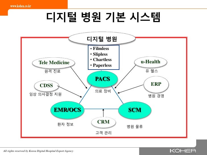 25. 25. Why PACS? 의료 영상 디지털 솔루션 • 의료 영상의 디지털 컨버젼스 Is : 핚국이 세계 보급률 1위 • 기본적 디지털 임상 짂단 지웎 Filmless Hospital 실현 • 효율적, 경제적인 영상 자료 조회, 보관, 젂송 • 영상 Modality(SONO, X-ray 등)의 DICOM 표준화 디지털 병웎의 Backbone To be : 모듞 수출용 의료장비는 • HIS/RIS EMR/OCS, SCM IF DICOM 표준을 수용핛 수 있어야 함 • CDSS, CRM, 융합 • Telemedicine, u-Health 확산의 기초All rights reserved by Korea Digital Hospital Export Agency