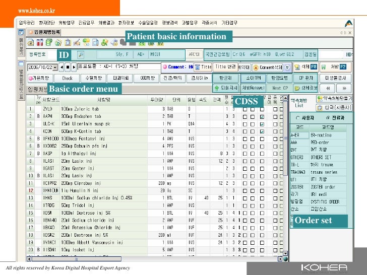 28. 28. Patient basic information ID Basic order menu CDSS Order setAll rights reserved by Korea Digital Hospital Export Agency