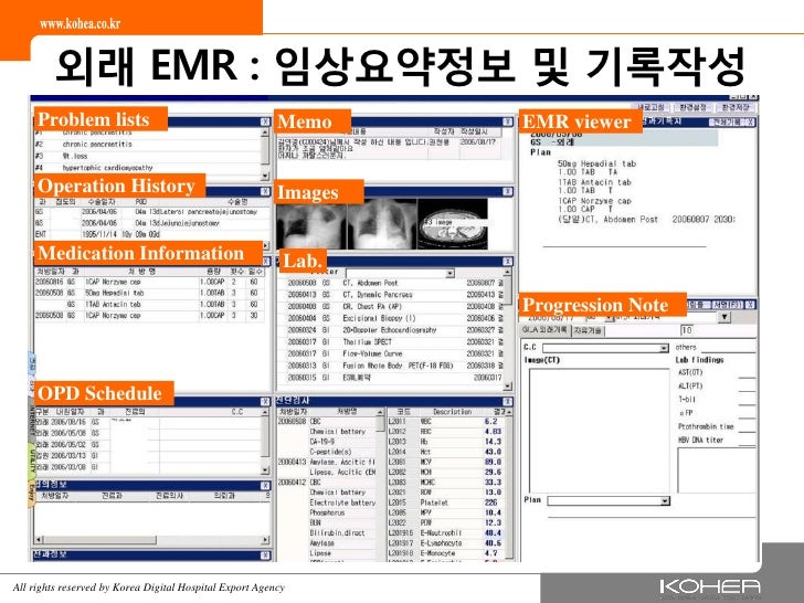 29. 29. 외래 EMR : 임상요약정보 및 기록작성 Problem lists Memo EMR viewer Operation History Images Medication Information Lab. Progression Note OPD ScheduleAll rights reserved by Korea Digital Hospital Export Agency