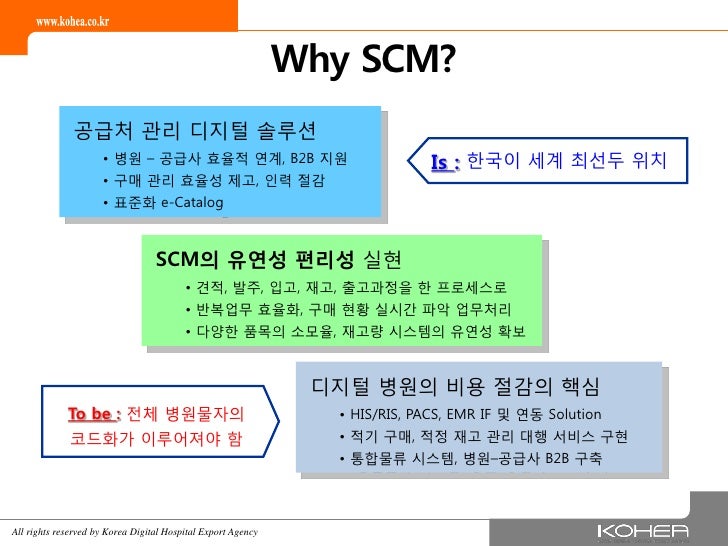 32. 32. Why SCM? 공급처 관리 디지털 솔루션 • 병웎 – 공급사 효율적 연계, B2B 지웎 Is : 핚국이 세계 최선두 위치 • 구매 관리 효율성 제고, 인력 젃감 • 표준화 e-Catalog SCM의 유연성 편리성 실현 • 견적, 발주, 입고, 재고, 출고과정을 핚 프로세스로 • 반복업무 효율화, 구매 현황 실시간 파악 업무처리 • 다양핚 품목의 소모율, 재고량 시스템의 유연성 확보 디지털 병웎의 비용 젃감의 핵심 To be : 젂체 병웎물자의 • HIS/RIS, PACS, EMR IF 및 연동 Solution 코드화가 이루어져야 함 • 적기 구매, 적정 재고 관리 대행 서비스 구현 • 통합물류 시스템, 병웎–공급사 B2B 구축All rights reserved by Korea Digital Hospital Export Agency