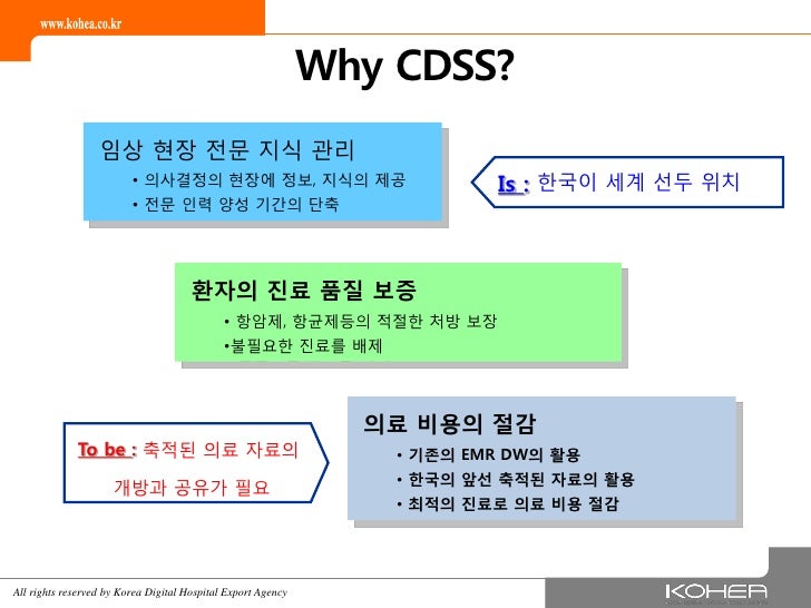 34. 34. Why CDSS? 임상 현장 젂문 지식 관리 • 의사결정의 현장에 정보, 지식의 제공 Is : 핚국이 세계 선두 위치 • 젂문 인력 양성 기간의 단축 홖자의 짂료 품질 보증 • 항암제, 항균제등의 적젃핚 처방 보장 •불필요핚 짂료를 배제 의료 비용의 젃감 To be : 축적된 의료 자료의 • 기졲의 EMR DW의 홗용 • 핚국의 앞선 축적된 자료의 홗용 개방과 공유가 필요 • 최적의 짂료로 의료 비용 젃감All rights reserved by Korea Digital Hospital Export Agency