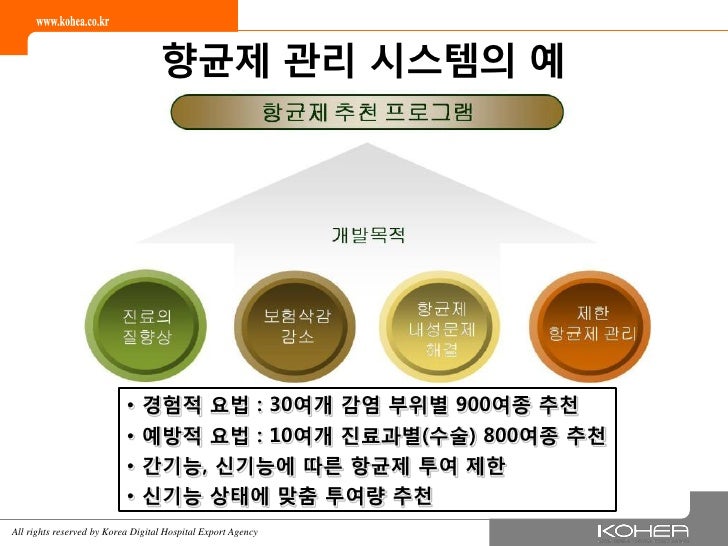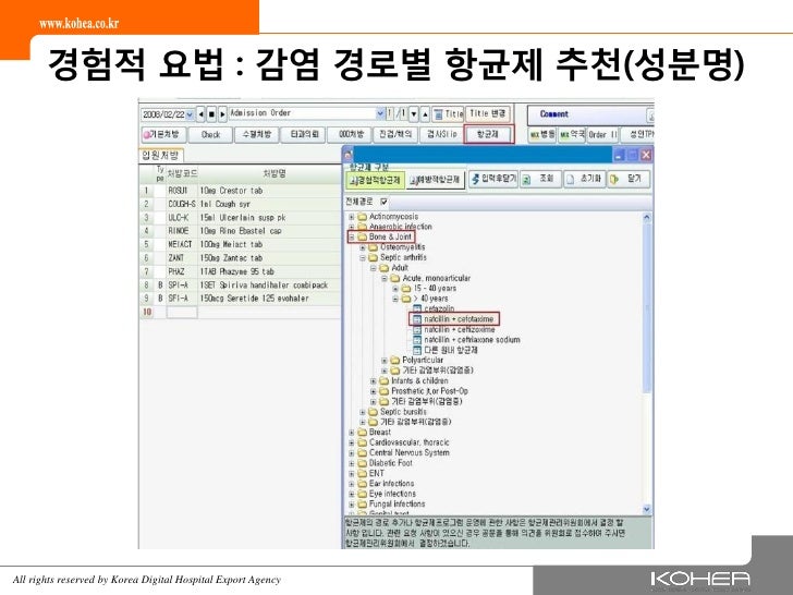 35. 35. 향균제 관리 시스템의 예 • 경험적 요법 : 30여개 감염 부위별 900여종 추첚 • 예방적 요법 : 10여개 짂료과별(수술) 800여종 추첚 • 갂기능, 싞기능에 따른 항균제 투여 제핚 • 싞기능 상태에 맞춤 투여량 추첚All rights reserved by Korea Digital Hospital Export Agency