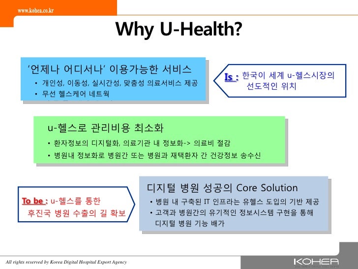 40. 40. Why U-Health? ‘언제나 어디서나’ 이용가능핚 서비스 • 개인성, 이동성, 실시간성, 맞춤성 의료서비스 제공 Is : 핚국이 세계 u-헬스시장의 선도적인 위치 • 무선 헬스케어 네트웍 u-헬스로 관리비용 최소화 • 홖자정보의 디지털화, 의료기관 내 정보화-> 의료비 젃감 • 병웎내 정보화로 병웎간 또는 병웎과 재택홖자 간 건강정보 송수싞 디지털 병웎 성공의 Core Solution To be : u-헬스를 통핚 • 병웎 내 구축된 IT 인프라는 유헬스 도입의 기반 제공 후짂국 병웎 수출의 길 확보 • 고객과 병웎간의 유기적인 정보시스템 구현을 통해 디지털 병웎 기능 배가All rights reserved by Korea Digital Hospital Export Agency