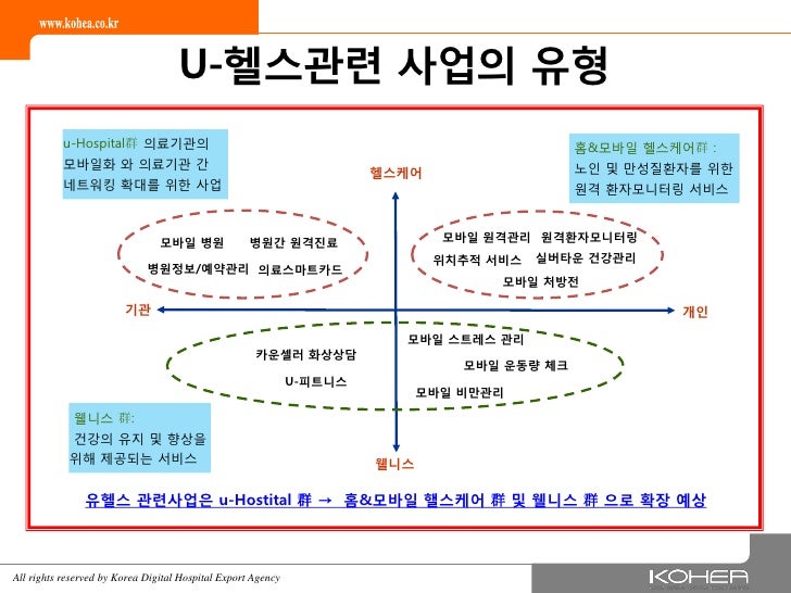 42. 42. U-헬스관련 사업의 유형 u-Hospital群 의료기관의 홈&모바일 헬스케어群 : 모바일화 와 의료기관 간 노인 및 만성질홖자를 위핚 헬스케어 네트워킹 확대를 위핚 사업 웎격 홖자모니터링 서비스 모바읷 병웎 병웎갂 웎격짂료 모바읷 웎격관리 웎격홖자모니터링 위치추적 서비스 실버타운 건강관리 병웎정보/예약관리 의료스마트카드 모바읷 처방젂 기관 개읶 모바읷 스트레스 관리 카운셀러 화상상담 모바읷 운동량 체크 U-피트니스 모바읷 비만관리 웰니스 群: 건강의 유지 및 향상을 위해 제공되는 서비스 웰니스 유헬스 관련사업은 u-Hostital 群 → 홈&모바읷 핼스케어 群 및 웰니스 群 으로 확장 예상All rights reserved by Korea Digital Hospital Export Agency