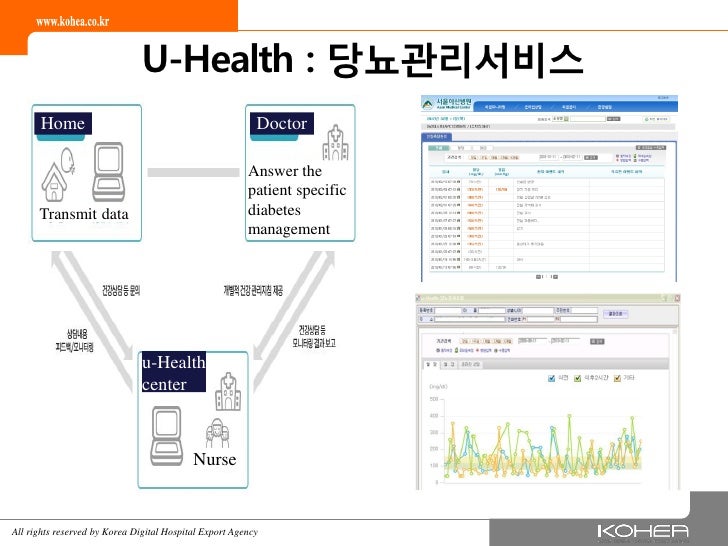 43. 43. U-Health : 당뇨관리서비스 Home Doctor Answer the patient specific Transmit data diabetes management u-Health center NurseAll rights reserved by Korea Digital Hospital Export Agency