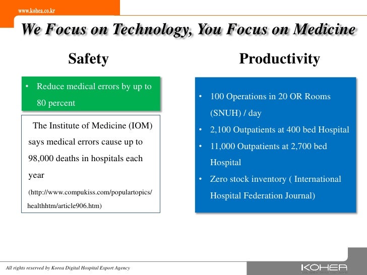44. 44. We Focus on Technology, You Focus on Medicine Safety Productivity • Reduce medical errors by up to • 100 Operations in 20 OR Rooms 80 percent (SNUH) / day The Institute of Medicine (IOM) • 2,100 Outpatients at 400 bed Hospital says medical errors cause up to • 11,000 Outpatients at 2,700 bed 98,000 deaths in hospitals each Hospital year • Zero stock inventory ( International (http://www.compukiss.com/populartopics/ Hospital Federation Journal) healthhtm/article906.htm)All rights reserved by Korea Digital Hospital Export Agency