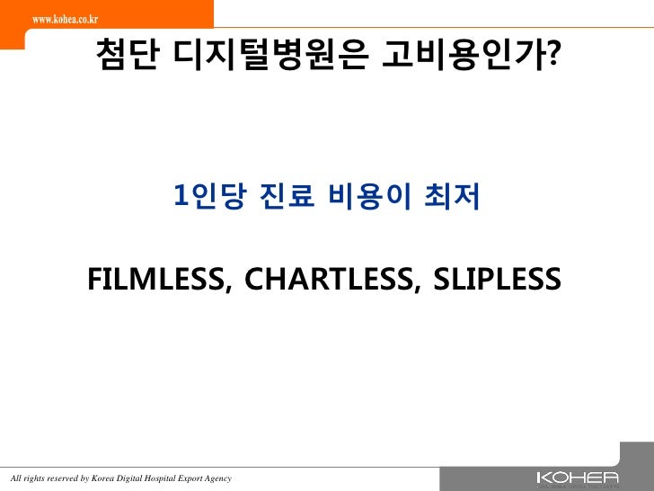 46. 46. 첨단 디지털병웎은 고비용읶가? 1읶당 짂료 비용이 최저 FILMLESS, CHARTLESS, SLIPLESSAll rights reserved by Korea Digital Hospital Export Agency