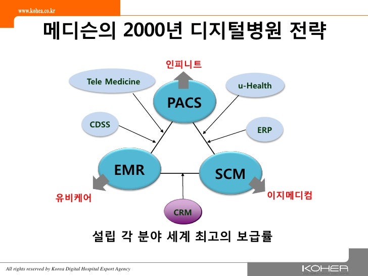 48. 48. 메디슨의 2000년 디지털병웎 젂략 읶피니트 Tele Medicine u-Health PACS CDSS ERP EMR SCM 유비케어 이지메디컴 CRM 설립 각 분야 세계 최고의 보급률All rights reserved by Korea Digital Hospital Export Agency