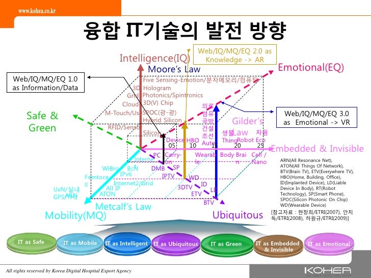 4. 4. 융합 IT기술의 발젂 방향 Web/IQ/MQ/EQ 2.0 as Intelligence(IQ) Knowledge -> AR Moore’s Law Emotional(EQ) Web/IQ/MQ/EQ 1.0 Five Sensing-Emotion/분자메모리/컴퓨팅 as Information/Data 3D Hologram Grid Photonics/Spintronics Cloud 3D(V) Chip 의료 SPOC(광-광) Safe & M-Touch/Use 섬유 Web/IQ/MQ/EQ 3.0 Hybrid Silicon 국방 Gilder’s as Emotional -> VR Green RFID/Sensor Silicon 건설 Law 자웎 조선 생물 Device HBO ThingRobot Eco 05 10 Auto15 20 25 Embedded & Invisible PC Carry- Wearab Body Brai Cell / Interne on le n Nano ARN(All Resonance Net), WiBro BcN t DMB SP ATON(All Things Of Network), BTV(Brain TV), ETV(Everywhere TV), IPv6 IPTV Femtoce WD HBO(Home, Building, Office), Internet2/Grid ID(Implanted Device), LD(Liable UsN/실내 ll All IP 3DTV ID LD Device In Body), RT(Robot ARN GPS/THz ATON ETV Technology), SP(Smart Phone), SPOC(Silicon Photonic On Chip) BTV Metcalf’s Law WD(Wearable Device) Mobility(MQ) Ubiquitous [참고자료 : 현창희/ETRI(2007), 안치 득/ETRI(2008), 하웎규/ETRI(2009)] IT as Safe IT as Mobile IT as Intelligent IT as Ubiquitous IT as Green IT as Embedded IT as Emotional & InvisibleAll rights reserved by Korea Digital Hospital Export Agency