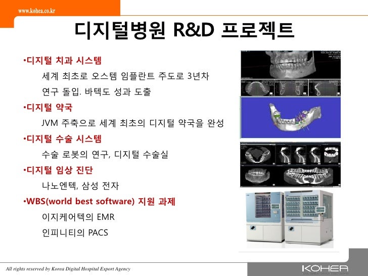 51. 51. 디지털병웎 R&D 프로젝트 •디지털 치과 시스템 세계 최초로 오스템 임플란트 주도로 3년차 연구 돌입. 바텍도 성과 도출 •디지털 약국 JVM 주축으로 세계 최초의 디지털 약국을 완성 •디지털 수술 시스템 수술 로봇의 연구, 디지털 수술실 •디지털 임상 짂단 나노엔텍, 삼성 젂자 •WBS(world best software) 지웎 과제 이지케어텍의 EMR 인피니티의 PACSAll rights reserved by Korea Digital Hospital Export Agency
