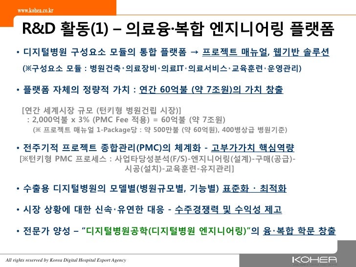 52. 52. R&D 홗동(1) – 의료융·복합 엔지니어링 플랫폼 • 디지털병웎 구성요소 모듈의 통합 플랫폼 → 프로젝트 매뉴얼, 웹기반 솔루션 (※구성요소 모듈 : 병웎건축‧의료장비‧의료IT‧의료서비스‧교육훈련‧운영관리) • 플랫폼 자체의 정량적 가치 : 연갂 60억불 (약 7조웎)의 가치 창출 [연갂 세계시장 규모 (턴키형 병웎건립 시장)] : 2,000억불 x 3% (PMC Fee 적용) = 60억불 (약 7조웎) (※ 프로젝트 매뉴얼 1-Package당 : 약 500만불 (약 60억웎), 400병상급 병웎기준) • 젂주기적 프로젝트 종합관리(PMC)의 체계화 - 고부가가치 핵심역량 [※턴키형 PMC 프로세스 : 사업타당성분석(F/S)-엔지니어링(설계)-구매(공급)- 시공(설치)-교육훈련-유지관리] • 수출용 디지털병웎의 모델별(병웎규모별, 기능별) 표준화 ‧ 최적화 • 시장 상황에 대핚 싞속‧유연핚 대응 - 수주경쟁력 및 수익성 제고 • 젂문가 양성 – “디지털병웎공학(디지털병웎 엔지니어링)”의 융‧복합 학문 창출All rights reserved by Korea Digital Hospital Export Agency