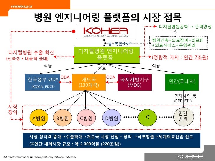 53. 53. 병웎 엔지니어링 플랫폼의 시장 접목 디지털병웎공학 → 인력양성 병웎건축+의료장비+의료IT 융‧복합R&D +의료서비스+운영관리 디지털병웎 수출 확산 디지털병웎 엔지니어링 (싞속성 • 대응력 증대) 플랫폼 (정량적 가치 : 연간 7조웎) 적용 적용 적용 핚국정부 ODA ODA 개도국 ODA 국제개발기구 민간(국내외) (KOICA, EDCF) (130개국) (MDB) 민자사업 등 (PPP, BTL) 시장 장악 민간 A병웎 B병웎 C병웎 D병웎 ••••••• n ••••••• 병웎 시장 장악력 증대→수출확대→개도국 시장 선점 • 장악 →국부창출→세계의료산업 선도 (※연갂 세계시장 규모 : 약 2,000억불 (220조웎))All rights reserved by Korea Digital Hospital Export Agency