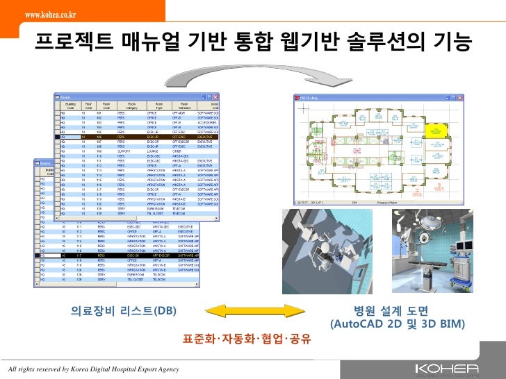 55. 55. 프로젝트 매뉴얼 기반 통합 웹기반 솔루션의 기능 의료장비 리스트(DB) 병웎 설계 도면 (AutoCAD 2D 및 3D BIM) 표준화‧자동화‧협업‧공유All rights reserved by Korea Digital Hospital Export Agency
