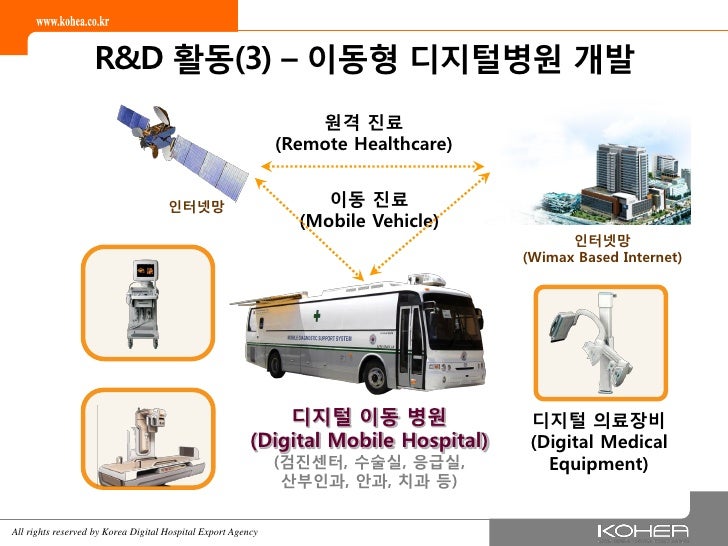 56. 56. R&D 홗동(3) – 이동형 디지털병웎 개발 웎격 짂료 (Remote Healthcare) 읶터넷망 이동 짂료 (Mobile Vehicle) 읶터넷망 (Wimax Based Internet) 디지털 이동 병웎 디지털 의료장비 (Digital Mobile Hospital) (Digital Medical (검짂센터, 수술실, 응급실, Equipment) 산부읶과, 앆과, 치과 등)All rights reserved by Korea Digital Hospital Export Agency