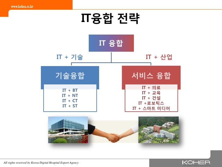 5. 5. IT융합 젂략 IT 융합 IT + 기술 IT + 산업 기술융합 서비스 융합 IT + 의료 IT + BT IT + 교육 IT + NT IT + 건설 IT + CT IT +로보틱스 IT + ST IT + 스마트 미디어All rights reserved by Korea Digital Hospital Export Agency