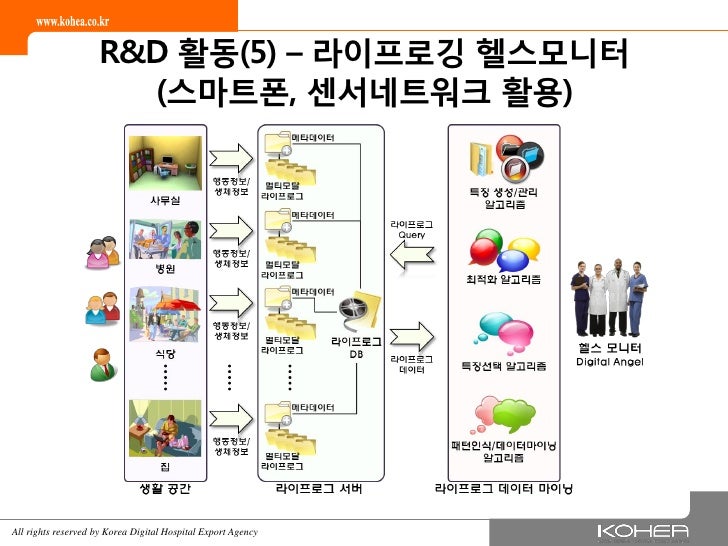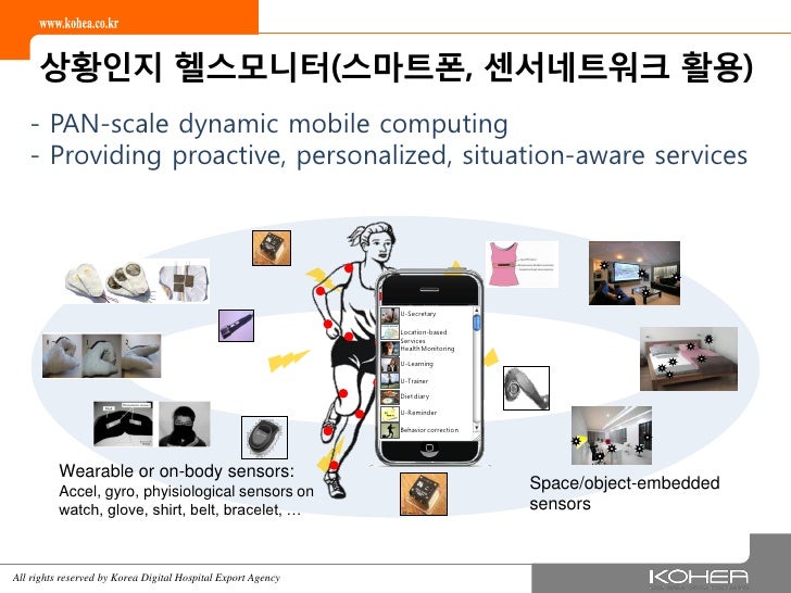 64. 64. 상황읶지 헬스모니터(스마트폰, 센서네트워크 홗용) - PAN-scale dynamic mobile computing - Providing proactive, personalized, situation-aware services U-Secretary Location-based Services Health Monitoring U-Learning U-Trainer Diet diary U-Reminder Behavior correction Wearable or on-body sensors: Accel, gyro, phyisiological sensors on Space/object-embedded watch, glove, shirt, belt, bracelet, … sensorsAll rights reserved by Korea Digital Hospital Export Agency