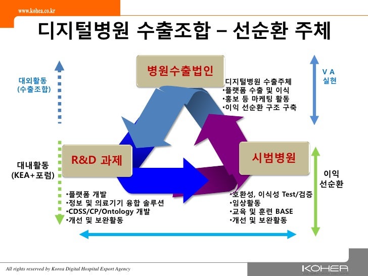 70. 70. 디지털병웎 수출조합 – 선순홖 주체 병웎수출법읶 VA 대외홗동 •디지털병웎 수출주체 실현 (수출조합) •플랫폼 수출 및 이식 •홍보 등 마케팅 홗동 •이익 선순홖 구조 구축 R&D 과제 시범병웎 대내홗동 (KEA+포럼) 이익 선순홖 •플랫폼 개발 •호홖성, 이식성 Test/검증 •정보 및 의료기기 융합 솔루션 •임상홗동 •CDSS/CP/Ontology 개발 •교육 및 훈련 BASE •개선 및 보완홗동 •개선 및 보완홗동All rights reserved by Korea Digital Hospital Export Agency