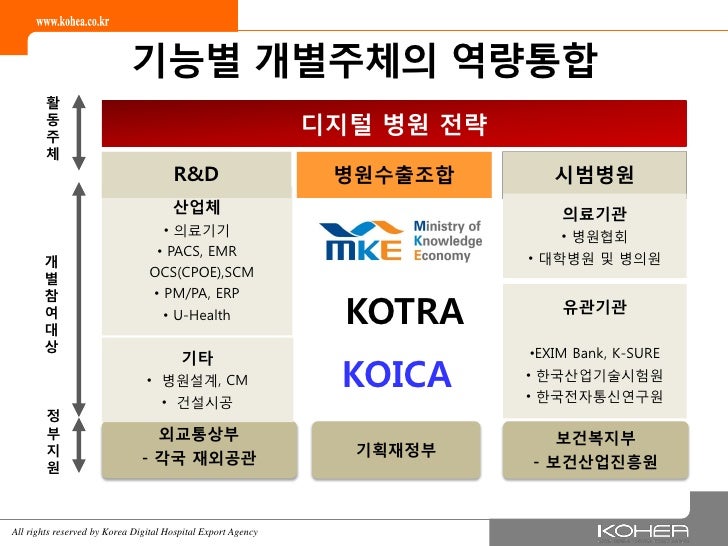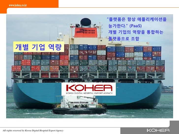 72. 72. “플랫폼은 항상 애플리케이션을 능가핚다.” (PaaS) 개별 기업의 역량을 통합하는 플랫폼으로 조합 개별 기업 역량All rights reserved by Korea Digital Hospital Export Agency