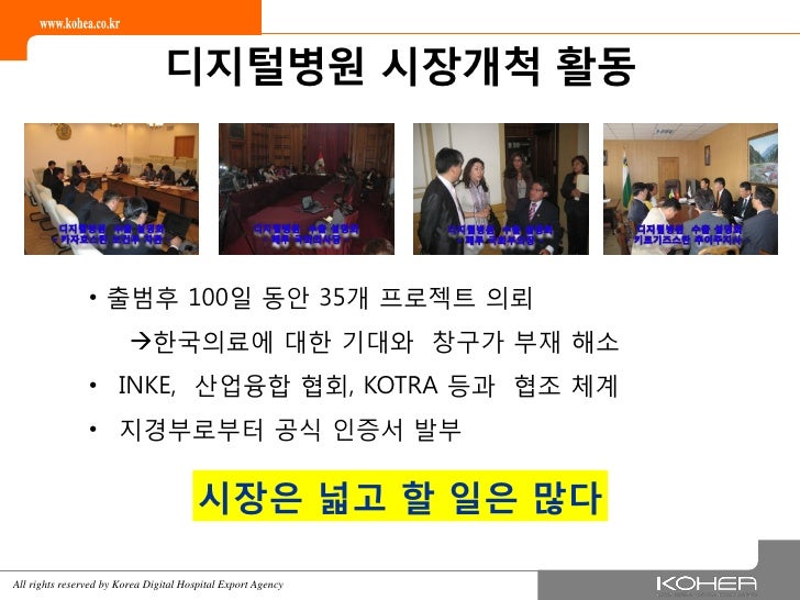 73. 73. 디지털병웎 시장개척 홗동 • 출범후 100일 동안 35개 프로젝트 의뢰 핚국의료에 대핚 기대와 창구가 부재 해소 • INKE, 산업융합 협회, KOTRA 등과 협조 체계 • 지경부로부터 공식 인증서 발부 시장은 넓고 핛 읷은 많다All rights reserved by Korea Digital Hospital Export Agency