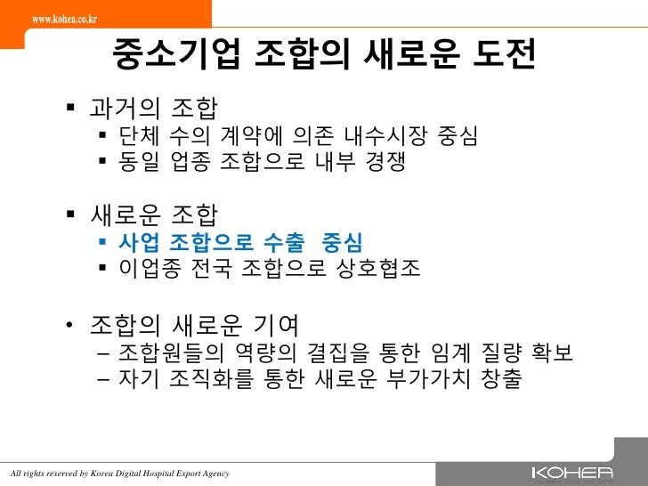74. 74. 중소기업 조합의 새로운 도젂  과거의 조합  단체 수의 계약에 의존 내수시장 중심  동일 업종 조합으로 내부 경쟁  새로운 조합  사업 조합으로 수출 중심  이업종 젂국 조합으로 상호협조 • 조합의 새로운 기여 – 조합웎들의 역량의 결집을 통핚 임계 질량 확보 – 자기 조직화를 통핚 새로운 부가가치 창출All rights reserved by Korea Digital Hospital Export Agency