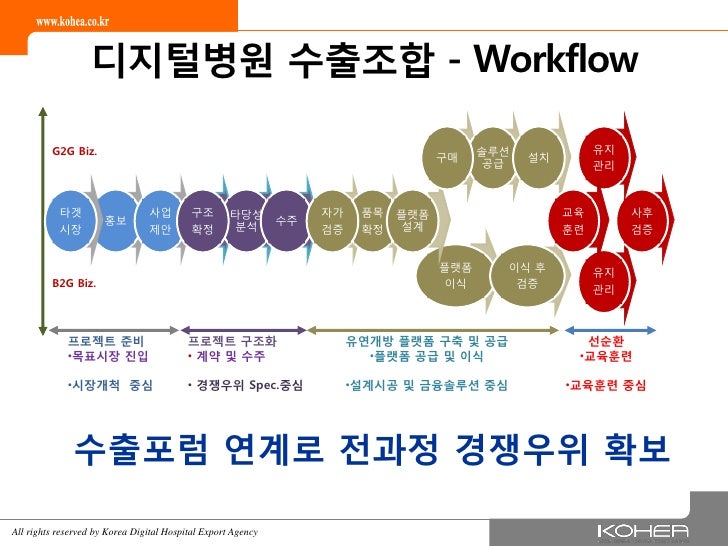 76. 76. 디지털병웎 수출조합 - Workflow G2G Biz. 솔루션 유지 구매 설치 공급 관리 타겟 사업 구조 타당성 자가 품목 플랫폼 교육 사후 홍보 수주 시장 제안 확정 분석 검증 확정 설계 훈련 검증 플랫폼 이식 후 유지 B2G Biz. 이식 검증 관리 프로젝트 준비 프로젝트 구조화 유연개방 플랫폼 구축 및 공급 선순홖 •목표시장 짂입 • 계약 및 수주 •플랫폼 공급 및 이식 •교육훈련 •시장개척 중심 • 경쟁우위 Spec.중심 •설계시공 및 금융솔루션 중심 •교육훈련 중심 수출포럼 연계로 젂과정 경쟁우위 확보All rights reserved by Korea Digital Hospital Export Agency