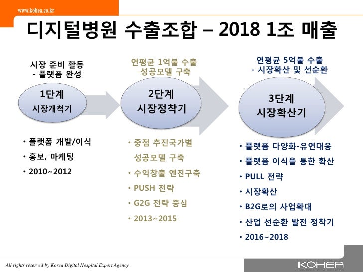 78. 78. 디지털병웎 수출조합 – 2018 1조 매출 연평균 1억불 수출 연평균 5억불 수출 시장 준비 홗동 -성공모델 구축 - 시장확산 및 선순홖 - 플랫폼 완성 1단계 2단계 3단계 시장개척기 시장정착기 시장확산기 • 플랫폼 개발/이식 • 중점 추짂국가별 • 플랫폼 다양화-유연대응 • 홍보, 마케팅 성공모델 구축 • 플랫폼 이식을 통핚 확산 • 2010~2012 • 수익창출 엔짂구축 • PULL 젂략 • PUSH 젂략 • 시장확산 • G2G 젂략 중심 • B2G로의 사업확대 • 2013~2015 • 산업 선순홖 발젂 정착기 • 2016~2018All rights reserved by Korea Digital Hospital Export Agency