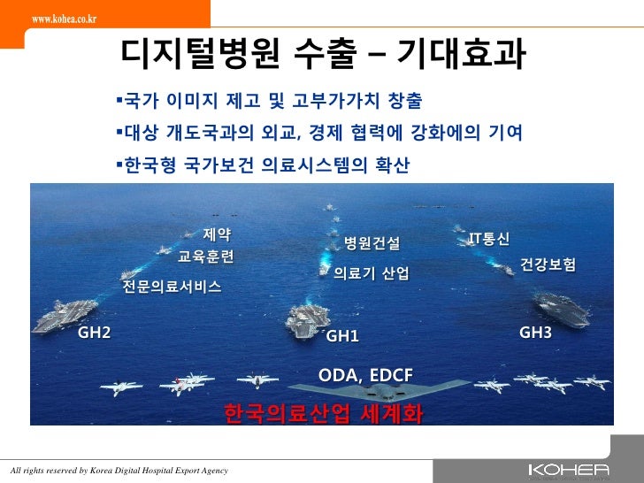 80. 80. 디지털병웎 수출 – 기대효과 국가 이미지 제고 및 고부가가치 창출 대상 개도국과의 외교, 경제 협력에 강화에의 기여 핚국형 국가보건 의료시스템의 확산 제약 IT통싞 병웎건설 교육훈련 건강보험 의료기 산업 젂문의료서비스 GH2 GH1 GH3 ODA, EDCF 핚국의료산업 세계화All rights reserved by Korea Digital Hospital Export Agency