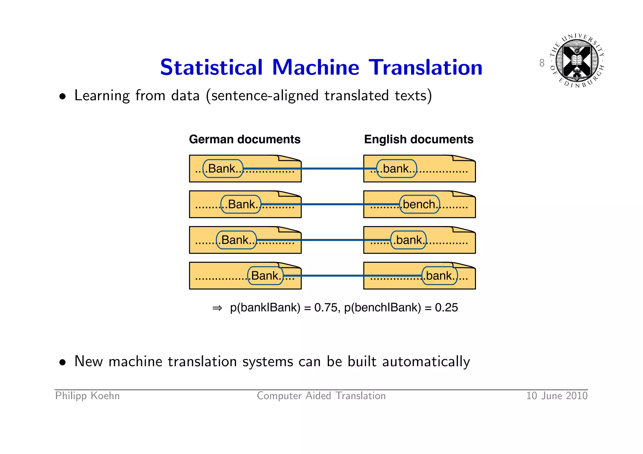 10. 10. 8 Statistical Machine Translation • Learning from data (sentence-aligned translated texts) German documents English documents ....Bank.................. ....bank.................. ..........Bank............ ..........bench.......... ........Bank.............. ........bank.............. .................Bank..... .................bank..... p(bank|Bank) = 0.75, p(bench|Bank) = 0.25 • New machine translation systems can be built automatically Philipp Koehn Computer Aided Translation 10 June 2010