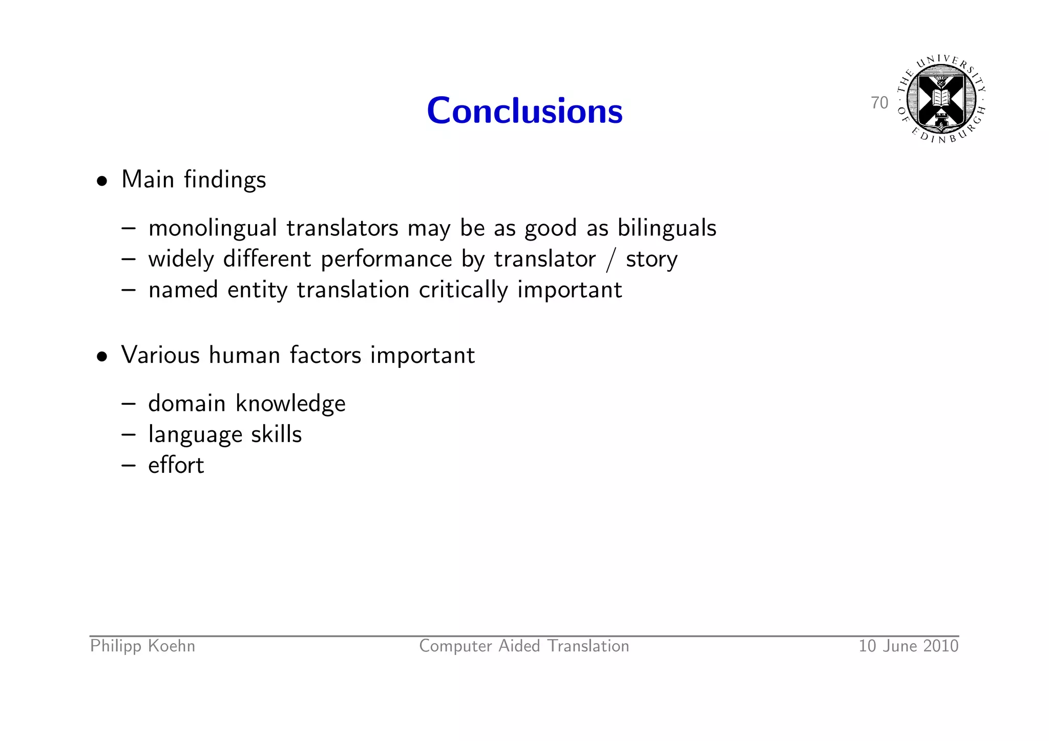103. 103. 70 Conclusions • Main findings – monolingual translators may be as good as bilinguals – widely different performance by translator / story – named entity translation critically important • Various human factors important – domain knowledge – language skills – effort Philipp Koehn Computer Aided Translation 10 June 2010
