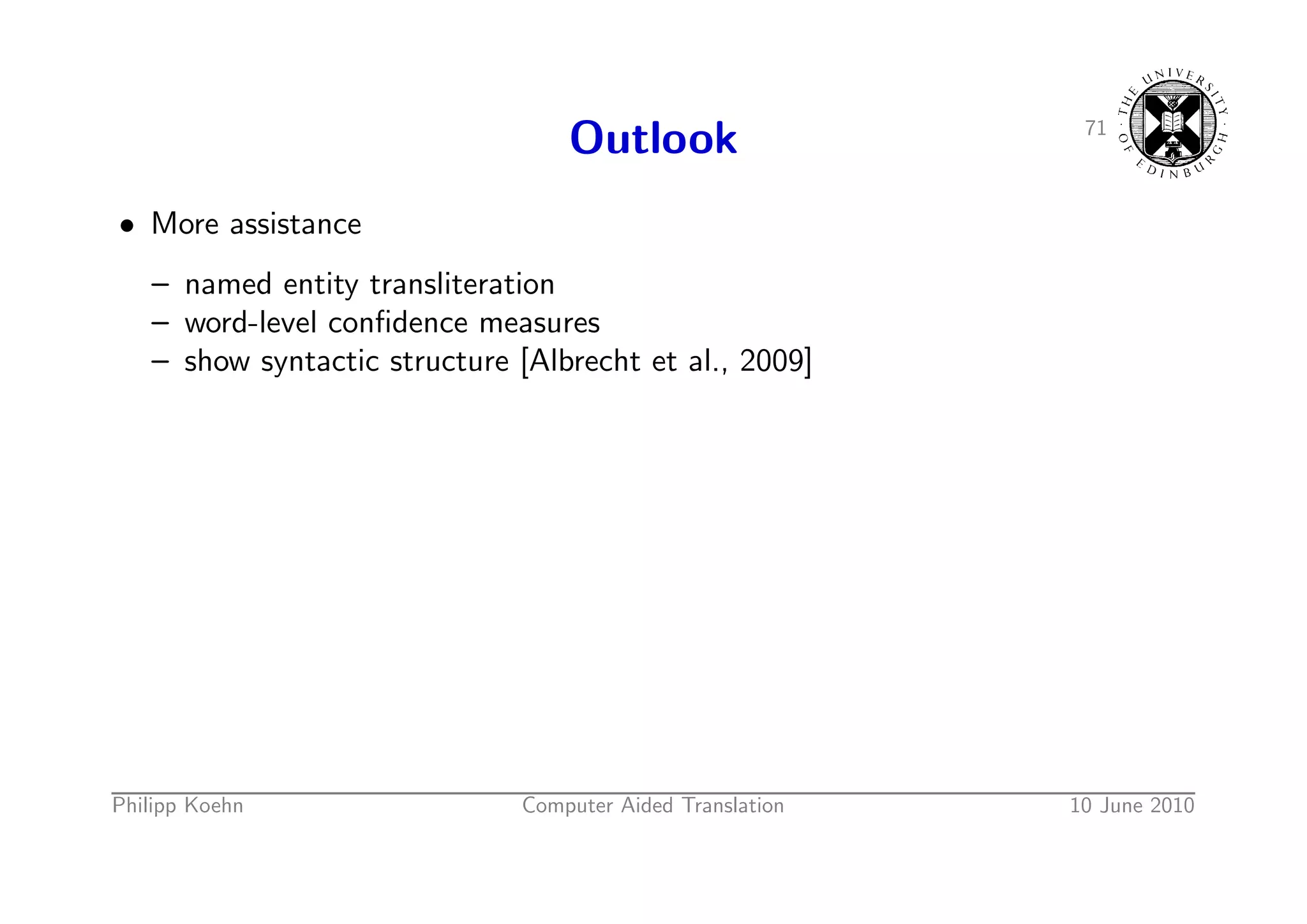 105. 105. 71 Outlook • More assistance – named entity transliteration – word-level confidence measures – show syntactic structure [Albrecht et al., 2009] Philipp Koehn Computer Aided Translation 10 June 2010