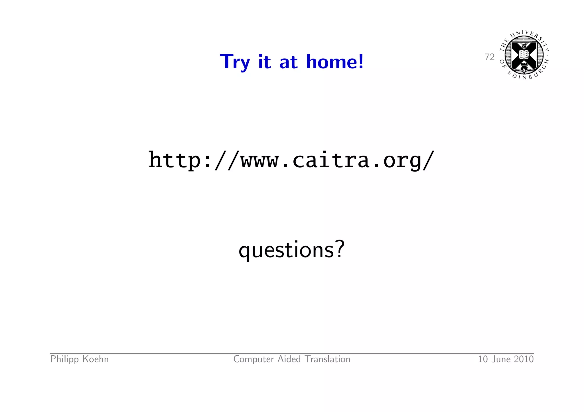 106. 106. 72 Try it at home! http://www.caitra.org/ questions? Philipp Koehn Computer Aided Translation 10 June 2010