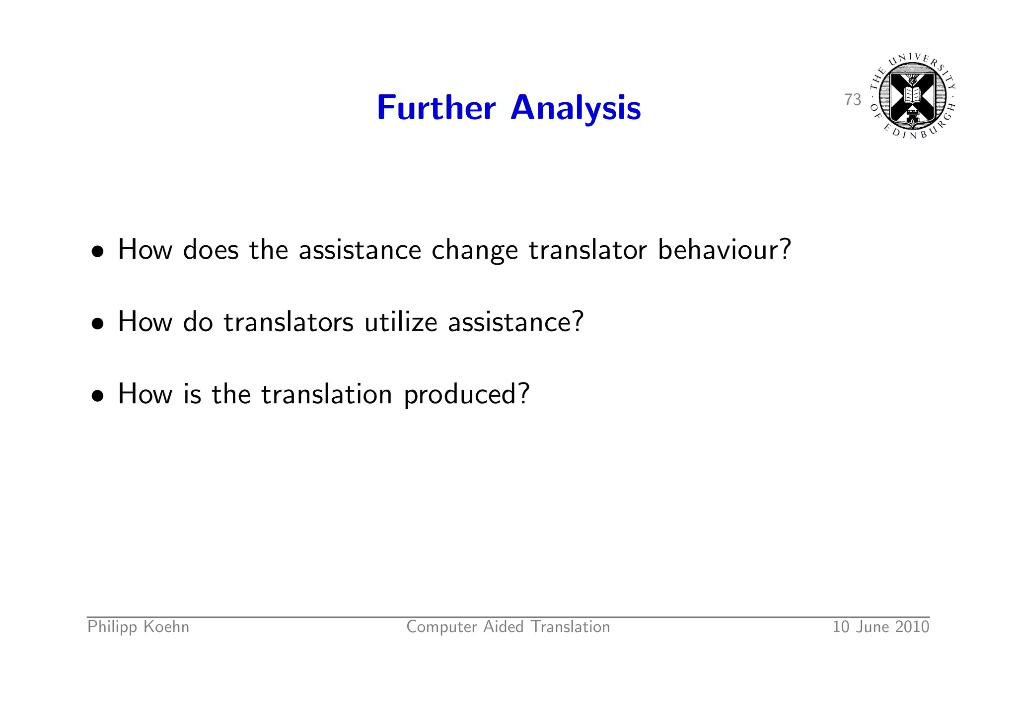 107. 107. 73 Further Analysis • How does the assistance change translator behaviour? • How do translators utilize assistance? • How is the translation produced? Philipp Koehn Computer Aided Translation 10 June 2010