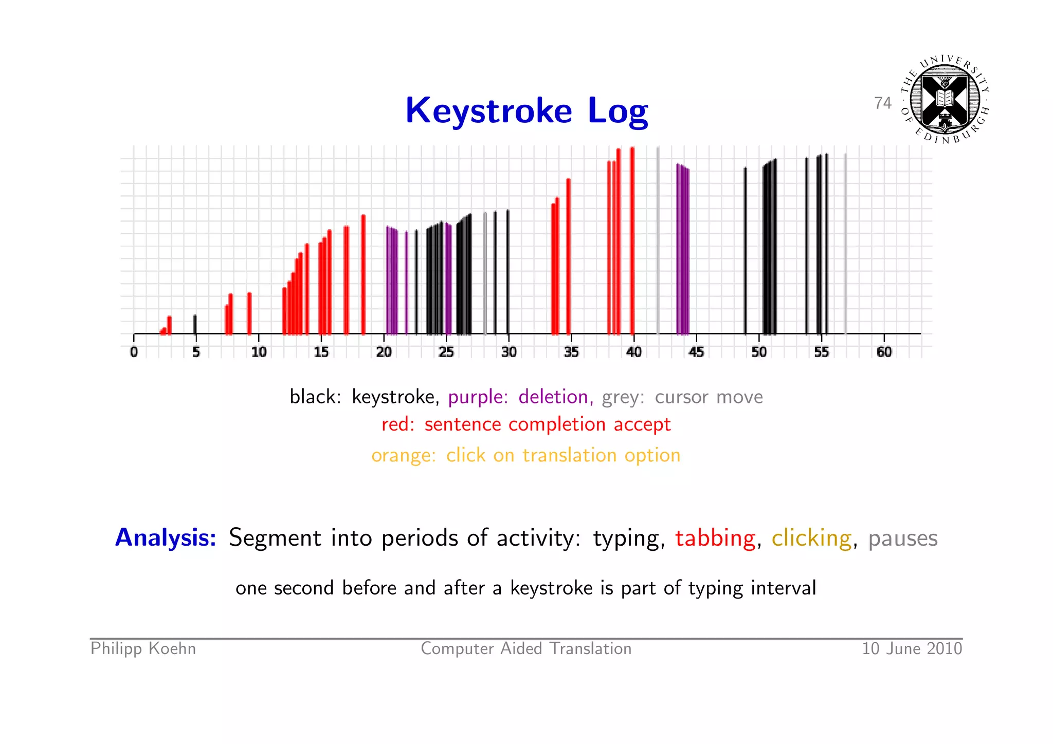 108. 108. 74 Keystroke Log black: keystroke, purple: deletion, grey: cursor move red: sentence completion accept orange: click on translation option Analysis: Segment into periods of activity: typing, tabbing, clicking, pauses one second before and after a keystroke is part of typing interval Philipp Koehn Computer Aided Translation 10 June 2010
