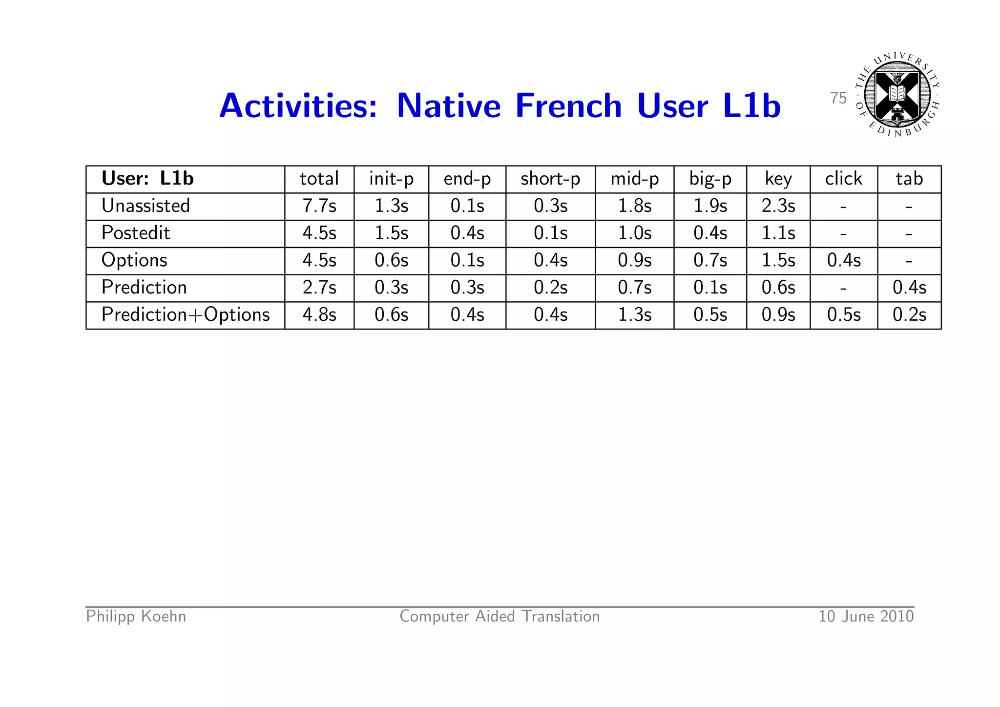 109. 109. 75 Activities: Native French User L1b User: L1b total init-p end-p short-p mid-p big-p key click tab Unassisted 7.7s 1.3s 0.1s 0.3s 1.8s 1.9s 2.3s - - Postedit 4.5s 1.5s 0.4s 0.1s 1.0s 0.4s 1.1s - - Options 4.5s 0.6s 0.1s 0.4s 0.9s 0.7s 1.5s 0.4s - Prediction 2.7s 0.3s 0.3s 0.2s 0.7s 0.1s 0.6s - 0.4s Prediction+Options 4.8s 0.6s 0.4s 0.4s 1.3s 0.5s 0.9s 0.5s 0.2s Philipp Koehn Computer Aided Translation 10 June 2010