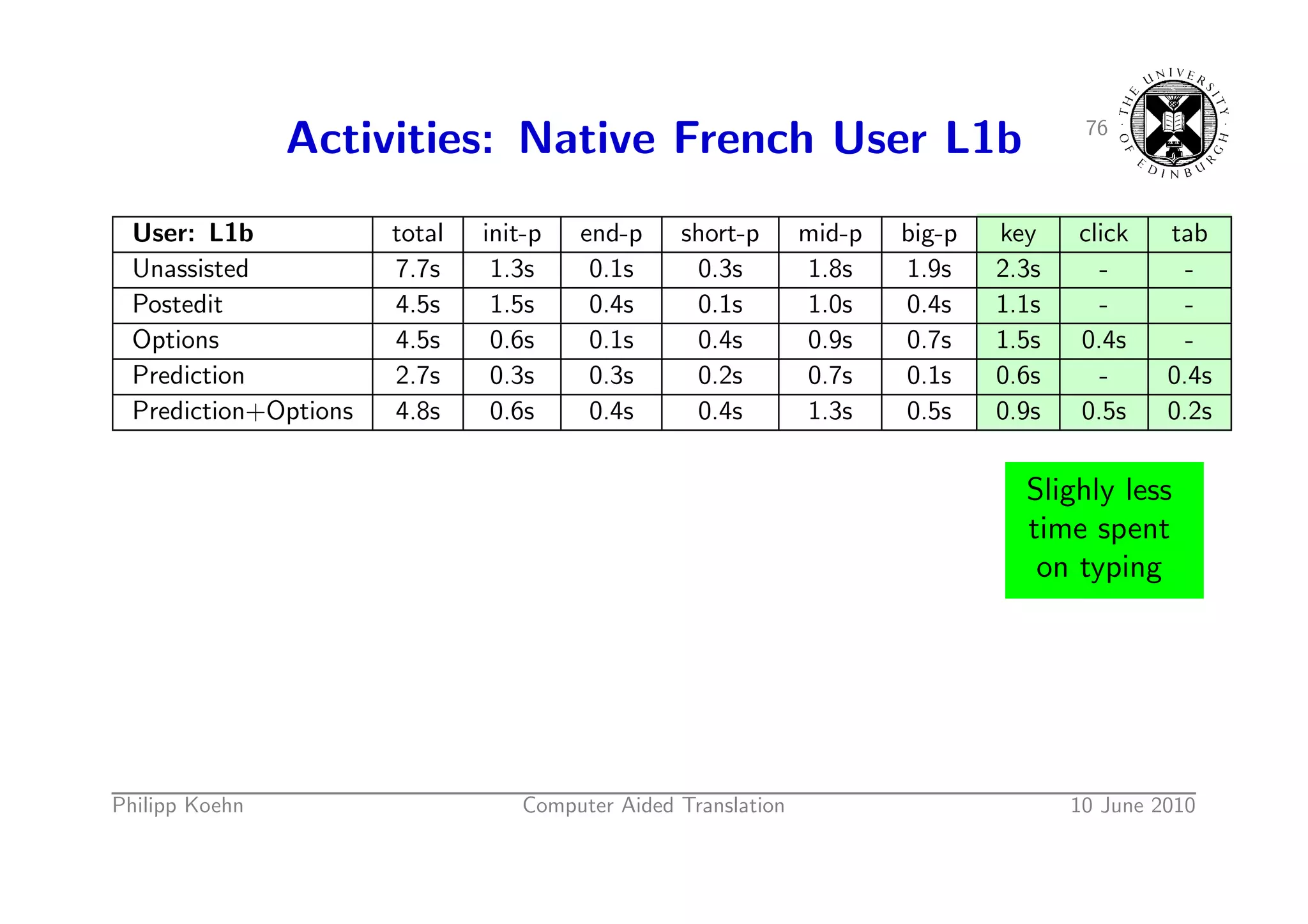 112. 112. 78 Activities: Native French User L1b User: L1b total init-p end-p short-p mid-p big-p key click tab Unassisted 7.7s 1.3s 0.1s 0.3s 1.8s 1.9s 2.3s - - Postedit 4.5s 1.5s 0.4s 0.1s 1.0s 0.4s 1.1s - - Options 4.5s 0.6s 0.1s 0.4s 0.9s 0.7s 1.5s 0.4s - Prediction 2.7s 0.3s 0.3s 0.2s 0.7s 0.1s 0.6s - 0.4s Prediction+Options 4.8s 0.6s 0.4s 0.4s 1.3s 0.5s 0.9s 0.5s 0.2s Less Especially Slighly less pausing less time time spent in big on typing pauses Philipp Koehn Computer Aided Translation 10 June 2010