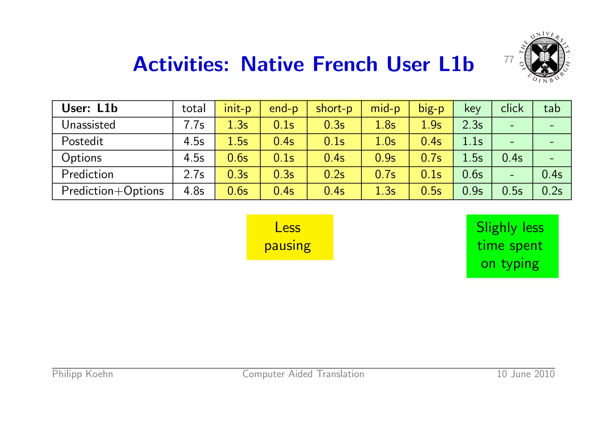 110. 110. 76 Activities: Native French User L1b User: L1b total init-p end-p short-p mid-p big-p key click tab Unassisted 7.7s 1.3s 0.1s 0.3s 1.8s 1.9s 2.3s - - Postedit 4.5s 1.5s 0.4s 0.1s 1.0s 0.4s 1.1s - - Options 4.5s 0.6s 0.1s 0.4s 0.9s 0.7s 1.5s 0.4s - Prediction 2.7s 0.3s 0.3s 0.2s 0.7s 0.1s 0.6s - 0.4s Prediction+Options 4.8s 0.6s 0.4s 0.4s 1.3s 0.5s 0.9s 0.5s 0.2s Slighly less time spent on typing Philipp Koehn Computer Aided Translation 10 June 2010